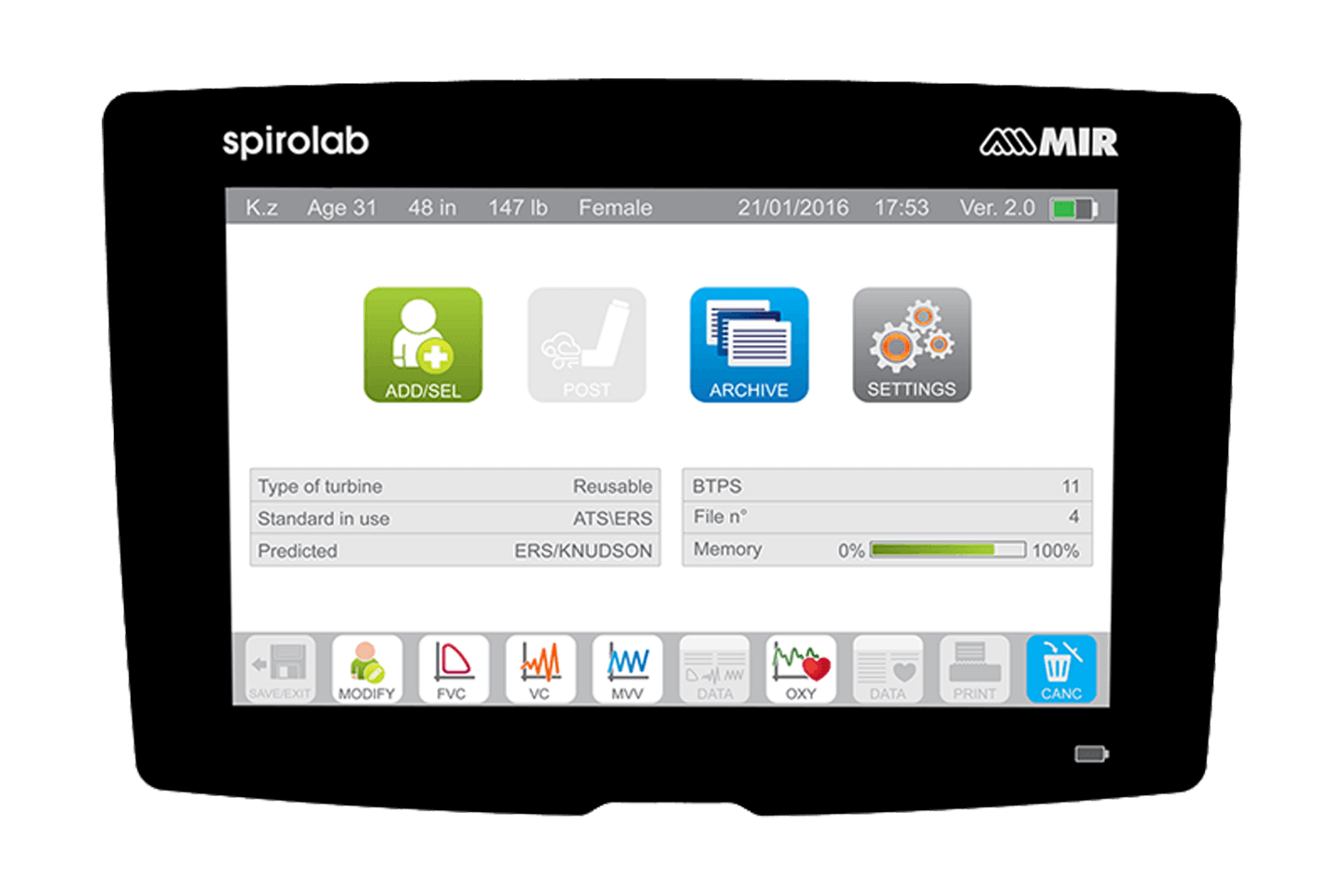 FVC, VC, MVV, PRE/POST Bronchodilatační porovnání s širokou škálou volitelných parametrů.